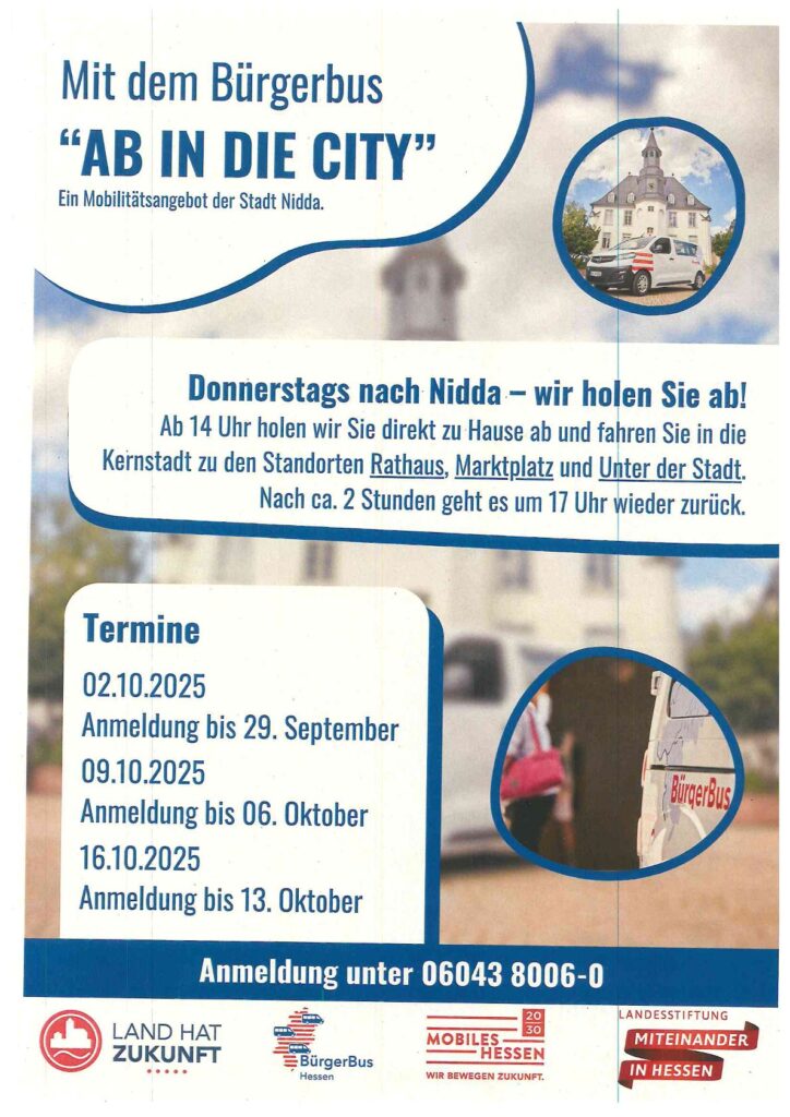 Ein Kleinbus für die Senioren ist bereits in Nidda unterwegs. Ehrenamtliche holen einige Senioren in den Stadtteilen ab, die den Mittagstisch im Karl-Dietz-Haus nutzen. Der Bus ist in die Jahre gekommen. Die Stadt beabsichtigt, ihn in absehbarer Zeit durch einen neuen zu ersetzen. Mit einem zusätzlichen Bürgerbus könnten auch Senioren zum Beispiel aus Schwickartshausen oder Fauerbach nach Wallernhausen zum Seniorentreff oder zum dortigen Mittagstisch kutschiert werden. Solche Angebote könne man ausbauen. »Wir müssen nicht in jedem Stadtteil einen Seniorentreff haben, sondern könnten die Menschen zusammenführen«, sagte die Vorsitzende Ute Kohlbecher. Klar ist auch, dass es nicht darum geht, den jetzigen Bus zu ersetzen, sondern das Angebot durch einen zweiten auszuweiten. Auch solle dies kein Parallelverkehr zum ÖPNV darstellen.